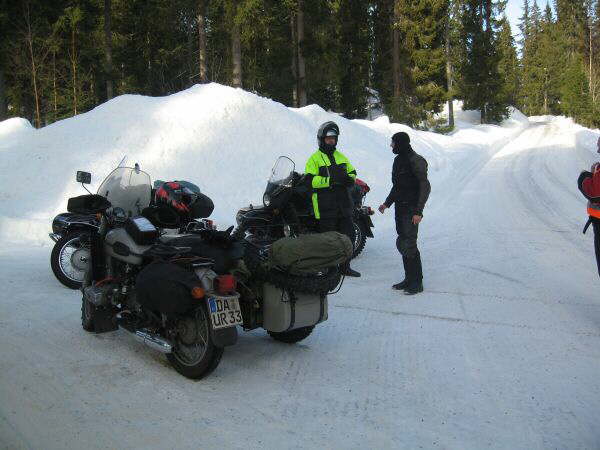 Nach Frank’s und meiner gemeinsamen Krystallrally-Reise 2005 war klar: Hier müssen wir wieder hin! Dem Aufruf im Frühjahr 2007 im Ural-Dnepr-Net: „Eine kleine chaotische aber nette Gruppe unverdrossener Russentreiber wird über Kiel-Oslo ein paar Tage über kleine und kleinste Sträßchen Norwegen unsicher machen. Kein Treffen á la Krystallrally mit im Hotel sitzen und Bier trinken, sondern Fahren, am Wegesrand ein Süppchen zur Brotzeit kochen und abends in der Hytta oder Zelt am Lagerfeuer Glühmost schlürfen und dummes Zeug quatschen. Garantiert wird für nix, geboten neben Fahren im Schneesturm auf eisglatten ungeräumten Strassen vor allem Landschaft und Gegend.“ Es folgten schnell begeisterte Meldungen, verblieben sind wir sechs Zwerge (Bernd, Frank, Johannes, Roman, Sven und ich) sowie unsere Eisprinzessin Anja als Roman’s Schmiermaxe im hoffnungslos überladenen Beiwagen.
