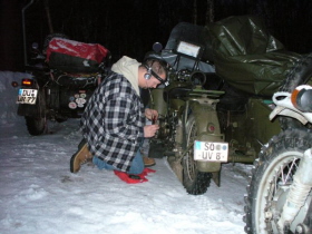 Im stockendustern steht unsere Gruppe mitten auf der Straße, kocht Tee und Bernd beschraubt mit Sven seine M72 – spontanes Existenzversagen des chinesischen Zündschlosses wird diagnostiziert und dank des mitgeführten Ersatzes auch behoben. Die Nacht ist wie geschaffen für sowas, kein Verkehr, klare Sicht und ab und an leichter Schneefall lassen die Reparatur als willkommene Pause erscheinen. Warm gewandet lassen sich Frank, Roman und Anja zum Sit-In mitten auf der Straße im Schnee nieder – wenn ein Auto gekommen wäre, was hätten die Insassen wohl gedacht ?